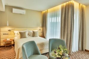 Ubytování je zajištěno ve dvoulůžkových pokojích Deluxe s možností až dvou přistýlek pro děti. Pokoje jsou vybaveny vlastní koupelnou s vysoušečem vlasů, klimatizací, SAT/TV, telefonem, setem na přípravu kávy a čaje, balkonem s výhledem na moře. Minibar je k dispozici za poplatek, ale trezor je zdarma.