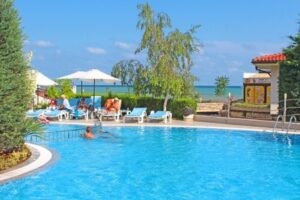 Hotel Blue Bay se nachází přímo u písečné pláže na severním okraji Slunečného pobřeží, což je ideální poloha pro ty, kteří hledají snadný přístup k moři. Centrum letoviska je vzdáleno asi 3 km a historické město Nesebar 5 km. Letiště v Burgasu je dostupné přibližně po 30 km.